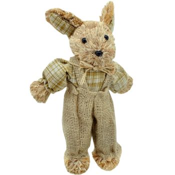 Slamený zajac v hnedom oblečení.
